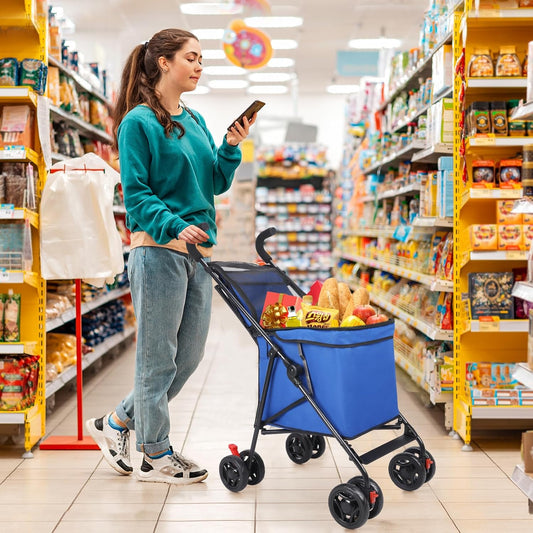 Pet Dog Stroller, 4 Wheel Foldable Cat Dog Stroller with Storage Basket, Handle 360° Front Wheel Rear Wheel with Brake for Small Medium Dogs & Cats (Blue)