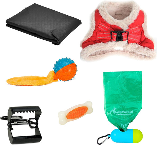 Pet Starter Kit, Warm Red Harness for Medium Dogs, Dog Crate Cover 42-Inch, Dog Ball Toy, Bacon Toy, Pooper Scooper + Dog Waste Bags 1000 Ct, Kit for Medium and Large Dogs